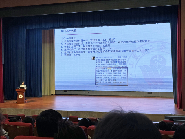 分享会上,王丽娜系统阐述了职业规划与学业发展的关键策略,倡导通过目的性学习、主动思考与复盘提升医学专业能力。针对科研与实习,她建议主动参与助研项目、善用实验资源,并基于职业规划选择适配实习点。考研复习方面,她重点解析了五步择校法与多渠道信息检索策略,分享了全年复习规划及西综、英语、政治的分科突破技巧,强调要以阶段性目标管理、高效时间分配和专注学习状态应对考试。在随后的交流互动环节,王丽娜对于同学们提出的问题进行了细致、耐心的解答,现场气氛热烈。