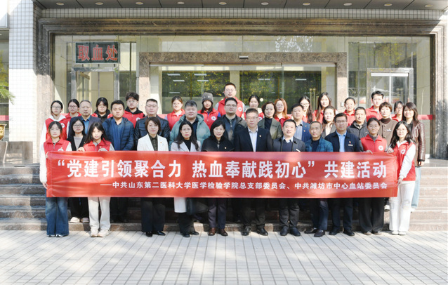 11月20日,山东第二医科大学医学检验学院党总支与潍坊市中心血站党委在潍坊市中心血站开展“党建引领聚合力 热血奉献践初心”共建活动。潍坊市中心血站党委书记、站长王胜,党委副书记、纪委书记解京泉,党委委员、副站长王夕钢、李雪梅及有关部门负责同志,医学检验学院班子成员姜广东、李康、孙艳丽及师生党员、入党积极分子代表共50余人参加活动。